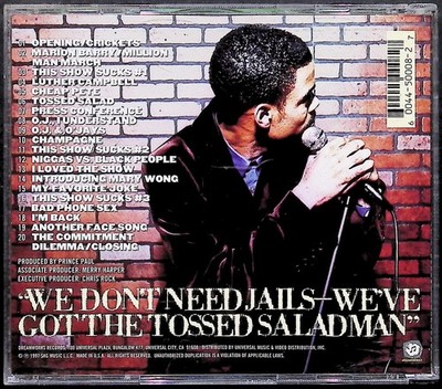 Track listing printed on back insert with 20 comedy bits including “Opening/Crickets,” “Marion Barry/Million Man March,” “This Show Sucks #1-3,” “Luther Campbell,” “Cheap Pete,” “Tossed Salad,” “Press Conference,” “O.J. Understand,” “Champagne,” “Niggas vs. Black People,” “My Favorite Jokes,” “Bad Phone Sex,” “I’m Back,” “Another Face Song,” and “The Commitment Dilemma/Closing.”