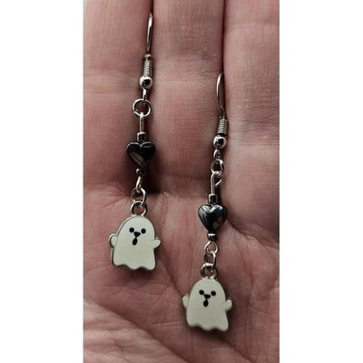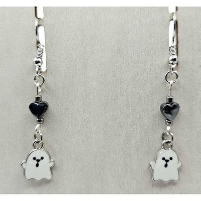 ♬Silver toned drop dangle earrings with cute ghosts. Hearts are made with hematite (good for: grounding, protection, and mental clarity).☺♬