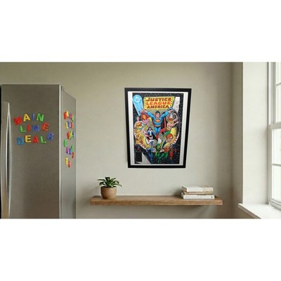 This listing features a framed Justice League of America 217 cover illustrated in the bold, dynamic style of legendary DC artist George Pérez. The artwork showcases Superman, Wonder Woman, Firestorm, Hawkman, Green Arrow, and other classic JLA members in a vibrant, action-packed composition. The printed page is mounted in a 12×16 all-plastic black frame with a clear protective front and arrives ready to hang.