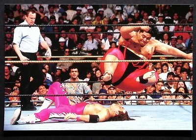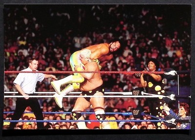 Branding/Logos: WWF scratch logo visible on ring posts/turnbuckles; RAW is WAR signage; WrestleMania branding and event text on card backs. Made by DuoCards, a subsidiary of Comic Images.